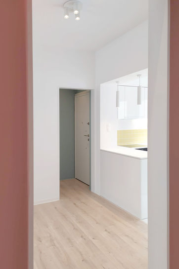 The new open plan suggests a unified living and kitchen space, that breaks the thresholds of the original fragmented plan, in order to maximize space and allow more natural light in the main space. The white palette is strategically interrupted by vivid colours, in order to intensify the entrance and circulation spaces, while green Tinos marble and yellow monochrome tiles appear as a subtle reference to the Athenian reconstruction period.